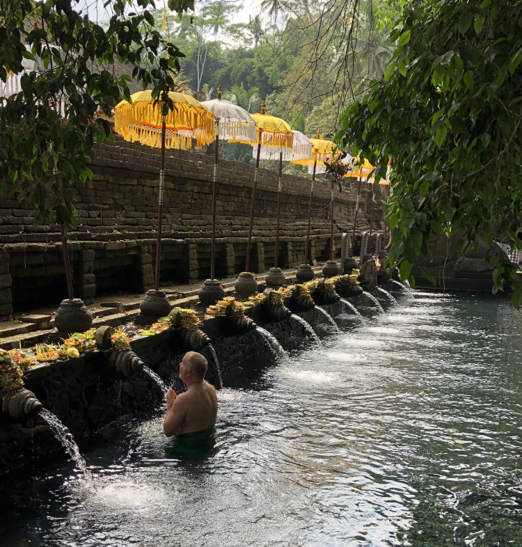 Wie dem auch sei. Da wir hier weder einen Yoga- noch einen Meditationskurs besuchen, wollen wir wenigstens in den beiden Tempeln ein bisschen was für Körper und Geist tun. Zumal ein Bad im hinduistischen Pura Tirta Empul Tempel nicht nur geistige und seelische Reinigung verspricht, sondern auch noch zur Heilung von Krankheiten beitragen soll.