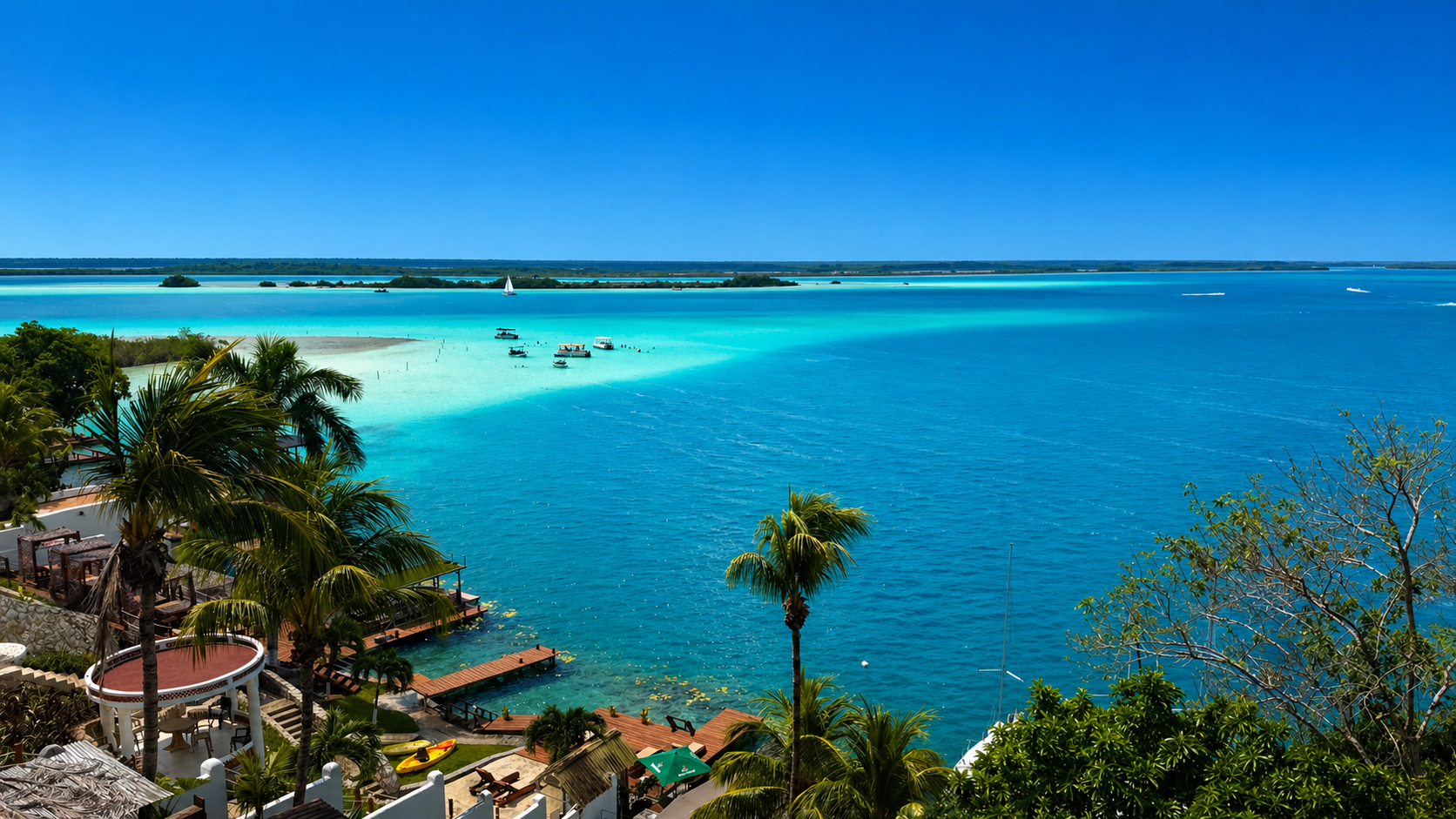 Der Blick über die Lagune von Bacalar mit seiner rund 42 km Länge und 2 km Breite wirkt wie ein heftiger Photoshop-Fail. Oder als habe Gott den Blau-Türkis-Farbregler von 100 auf 1.000 % hochgezogen.