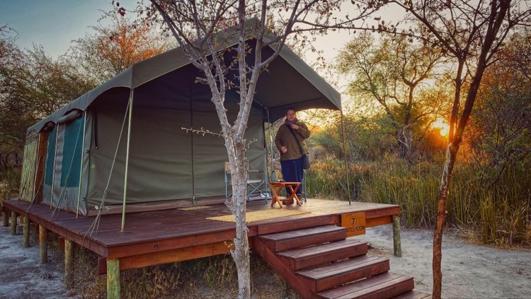 Die Boteti Tented Safari Lodge bietet, wie der Name schon vermuten lässt, ein paar wenige Zelte zur Übernachtung (nicht nur) für durchgeschüttelte und verstaubte Camper-Schmitze an. Wobei ehrlicherweise an dieser Stelle der Begriff „Glamping“ Einzug in diesen Blogbeitrag halten muss. Denn für 2 Nächte gönnen wir uns die luxuriöse, behütete, exklusive und staubfreie All-Inclusive-Disneyland-Variante des Zeltens in Afrika. Zu unser beider Überraschung und großen Freude sogar abends mit 2 Wärmflaschen im Doppelbett.