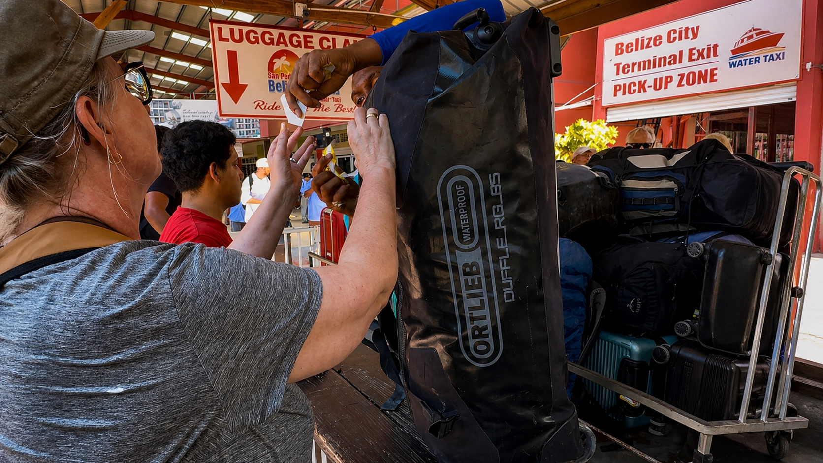 Nach etwa 2,5 Stunden erreichen wir gut gekühlt die Grenze von Belize. Wir kennen das schon von Guatemala: alle aussteigen! Also alle ausgestiegen. Erstmal Schlange stehen. Eine Kasse ist geöffnet. Und die Dame mit dem Computer hat es nicht eilig. Ich unterhalte mich mit einem dringend gewordenen Toilettengang.
