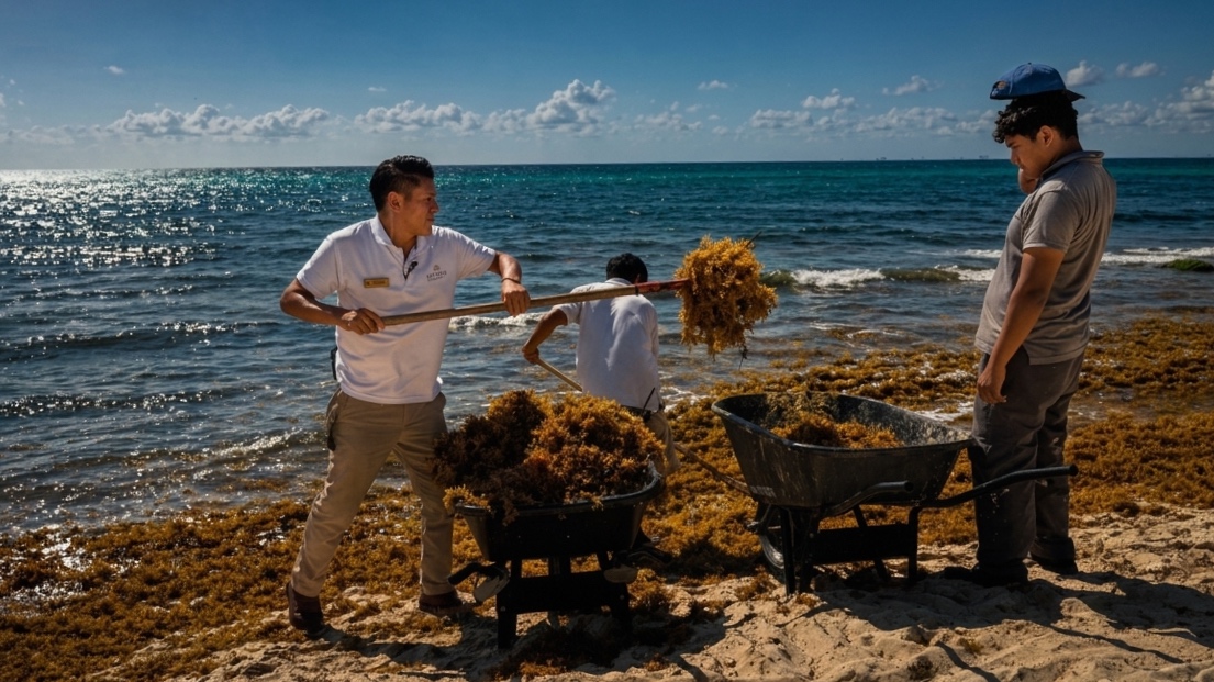 Die drei Bediensteten schieben ihre Schubkarren an uns vorbei Richtung Sargassum-Sammelstelle.